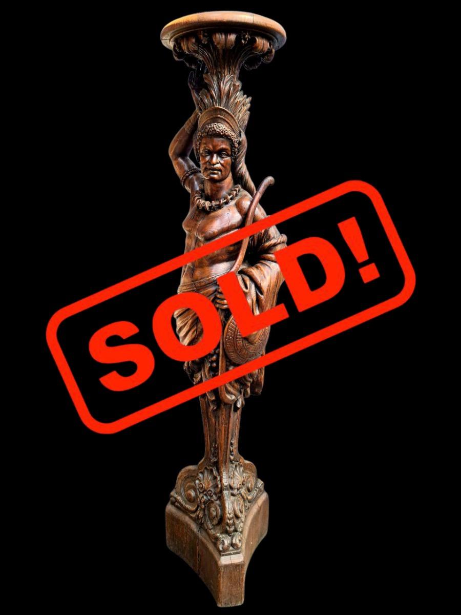 Very impressive torch, carved in oak and representing "America" with this Indian figure. H 198 cm